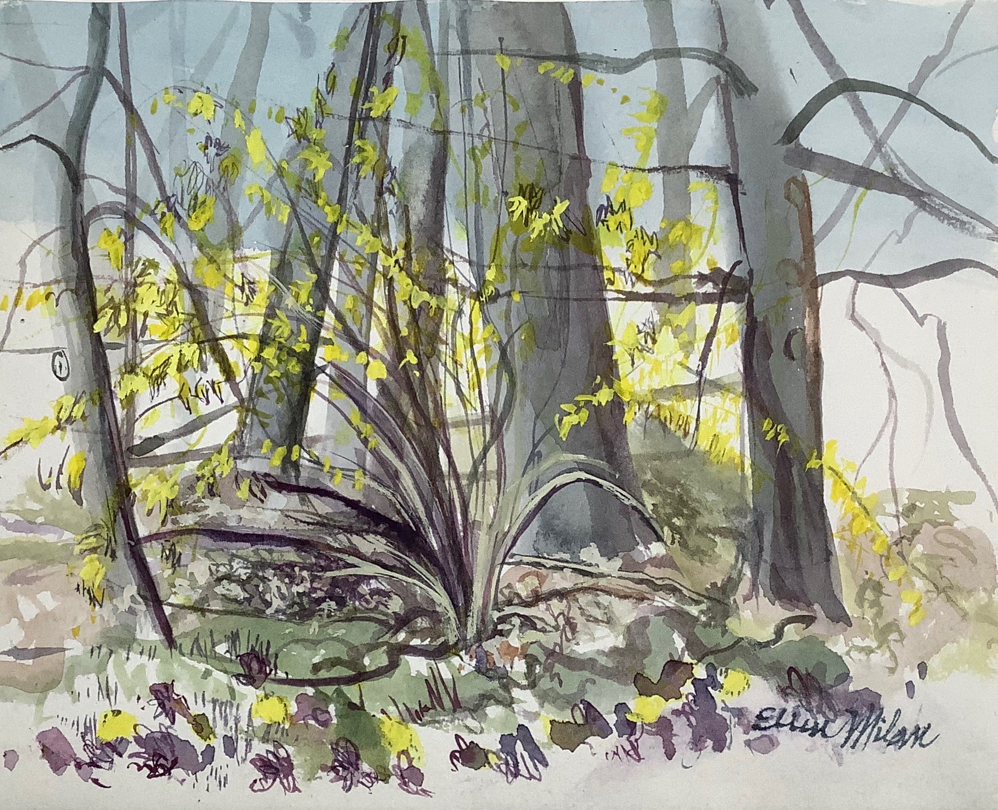 “Forsythia in Early Spring” watercolor 8″ x 10″
