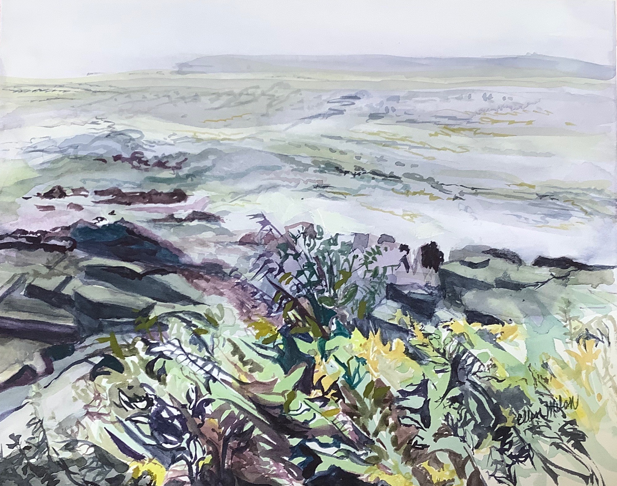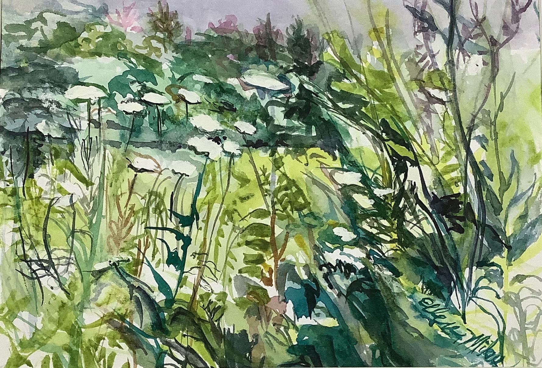 “White Flowers in Field” watercolor 5″ x 7″